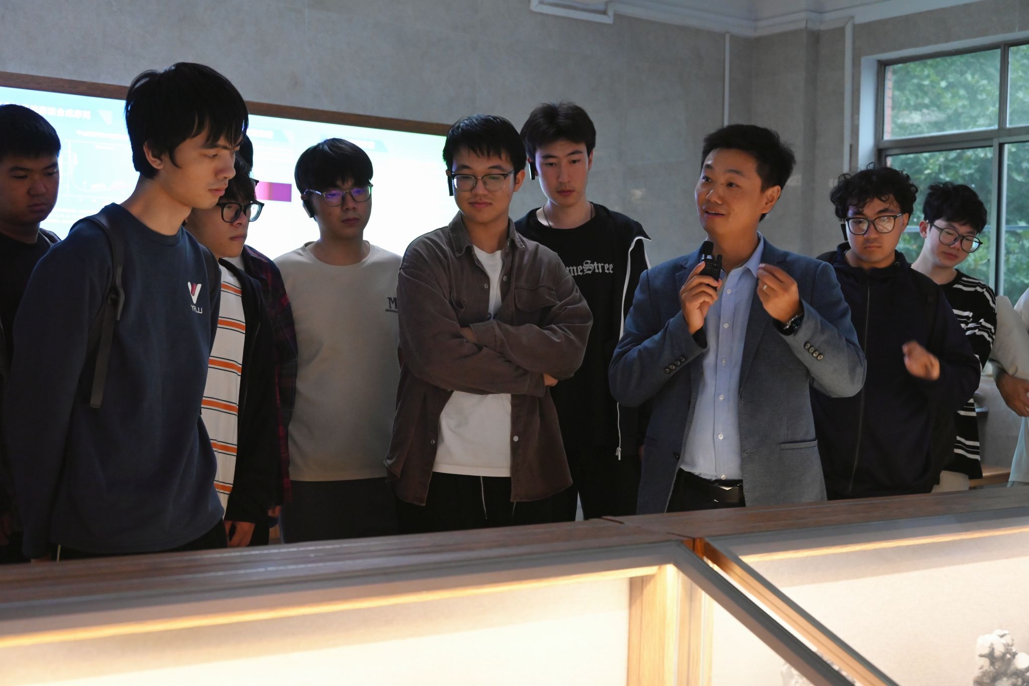 汪方跃以展厅中的矿物标本为切入点,从最基本的化学元素出发,系统解析了地球的物质组成与演化历程。他带领同学们近距离观察各类典型标本,结合生动案例,阐释矿物组合的规律、岩石形成的机制以及矿石资源的价值,引导同学们身临其境地走进地球的物质世界,理解自然资源对国家发展的重要意义。在讲课过程中,汪方跃系统回顾了我国地学工作者跋山涉水、勘探资源的奋斗历程,鼓励同学们传承地质先辈热爱祖国、追求理想、执着科研的精神特质,在新时代肩负起资源保障与生态文明建设的青年责任。