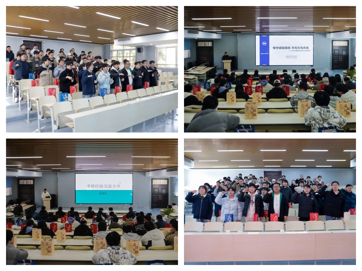 会议最后,学院毕业班辅导员杨子凡作考前诚信专题教育,结合国家教育考试相关法律法规与学校规章制度,剖析典型考研作弊案例,深入阐述了诚信应试的重要性与严肃性。环境工程22-1班杨挺进同学带领全体考研学子庄严宣誓,铿锵有力的誓言,展现了同学们迎难而上、不负韶华的决心与勇气。